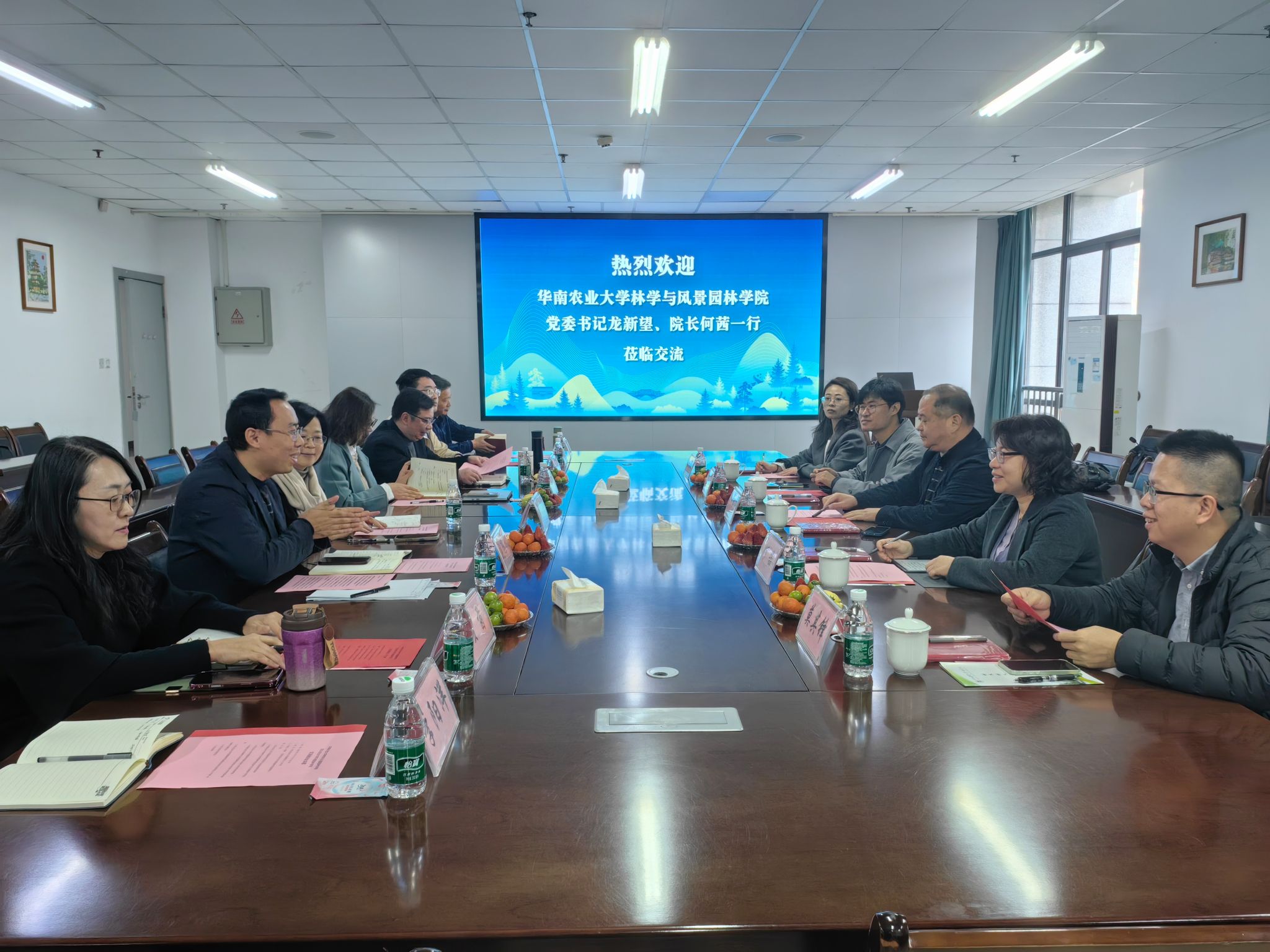 4月3日,华南农业大学林学与太阳城官网 党委书记龙新望一行5人来校交流座谈。太阳城官网 党委书记饶远林、院长李西,副院长姜贝贝、蔡军及相关系室中心负责人参加座谈会。