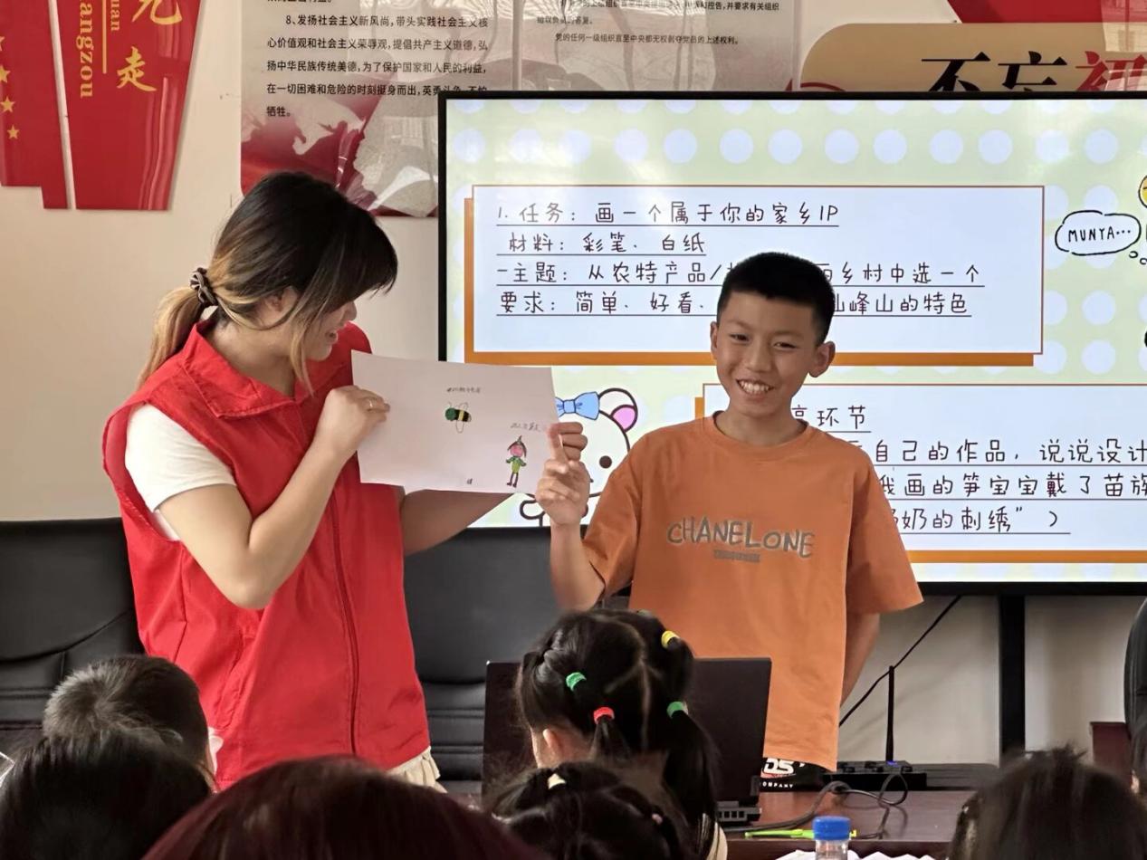 乡土文韵共守护,青春聚力乡魂兴。“乡育青禾·竹起风韵”团队,深度挖掘宜宾市兴文县在地资源,融合宜宾红色史料,蜀南竹海,兴文石海等元素制定“美育赋能+文化传承+安全护航”系列公益课程。团队通过“英雄故事会”、“竹起风韵”、“苗族蜡染”、“家乡IP设计”等课程,完成手工与设计作品90余件。“看到孩子们指着自己设计的‘石海小怪兽’说‘这是我的家乡’,就知道文化的种子已经种下。”队员分享。此次夏令营不仅让当地儿童读懂了家乡的红色历史与非遗文化,更让优秀传统文化在青春接力中焕发新活力。