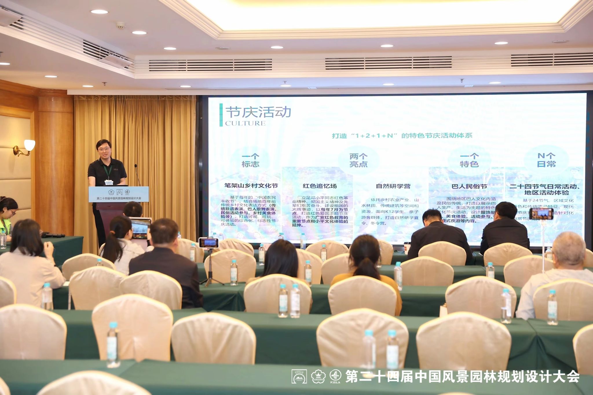 28日下午,刘柿良在第五分会场—乡村振兴规划设计分会场作了“农文旅融合·构建原真体系:以小平故里原真性农文旅融合产业园规划设计为例”的主题报告。报告主要针对当前乡村风貌趋同、乡土景观原真性受到破坏以及乡村文化传承面临挑战等问题,以小平故里农文旅融合产业园规划设计为例,阐述了构建的乡村振兴农文旅融合“四原”体系内涵和设计策略,报告受到了与会者一致好评。
