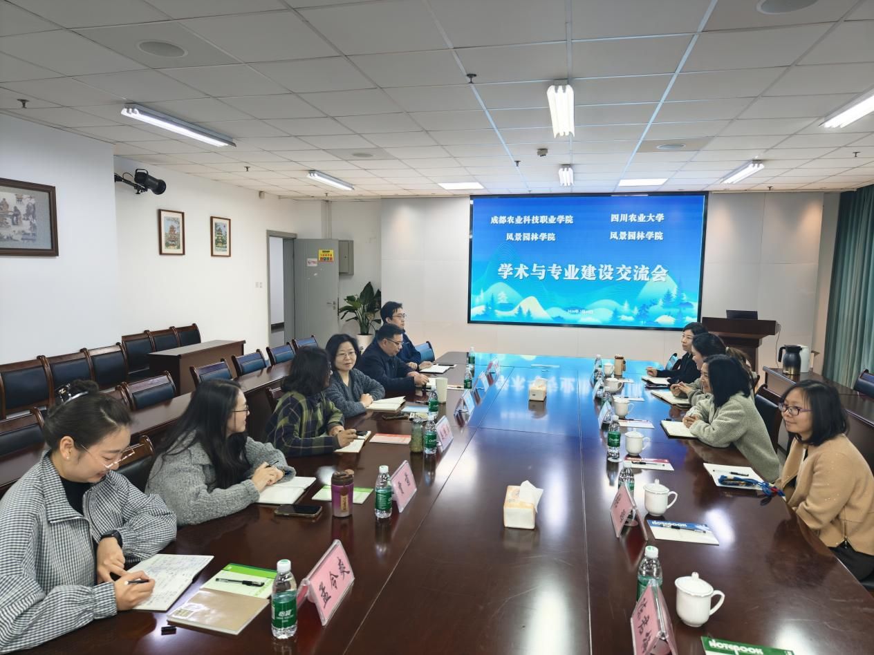 3月25日,成都农业科技职业太阳城官网 太阳城官网 副院长汪源、教管办主任何叔贤、环艺专业带头人李珍林、园林工程技术专业带头人张璐及陈君梅老师一行来访太阳城官网-澳门太阳城官网 ,就专业建设、人才培养、实践教学及合作发展等内容开展交流。太阳城官网 院长李西,副院长姜贝贝、蔡军,教研组主任潘翔、贾茵,教师孟令爽参加交流。会议由李西主持。